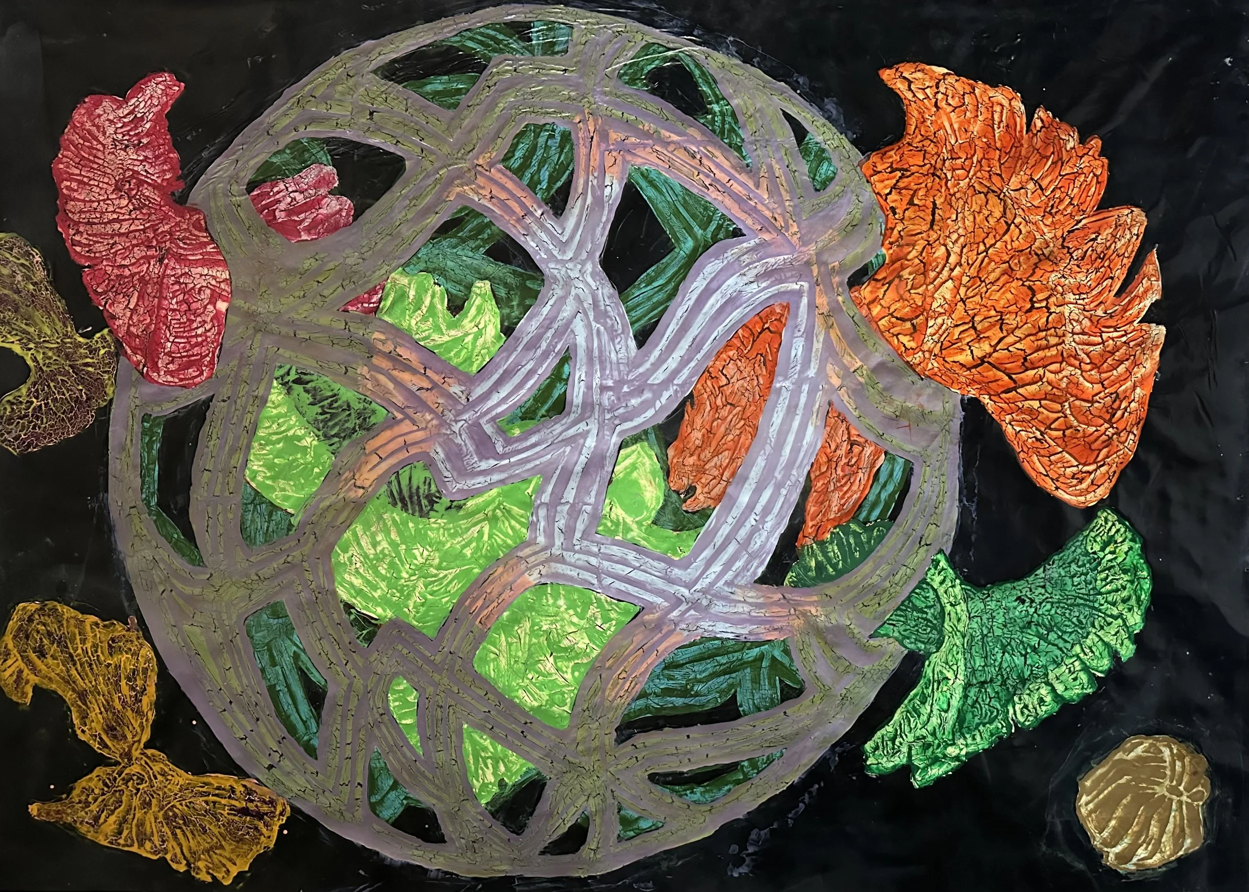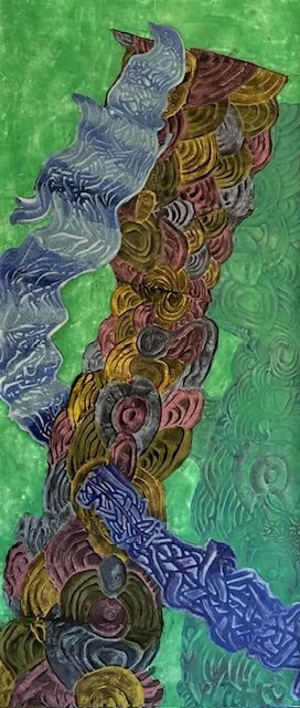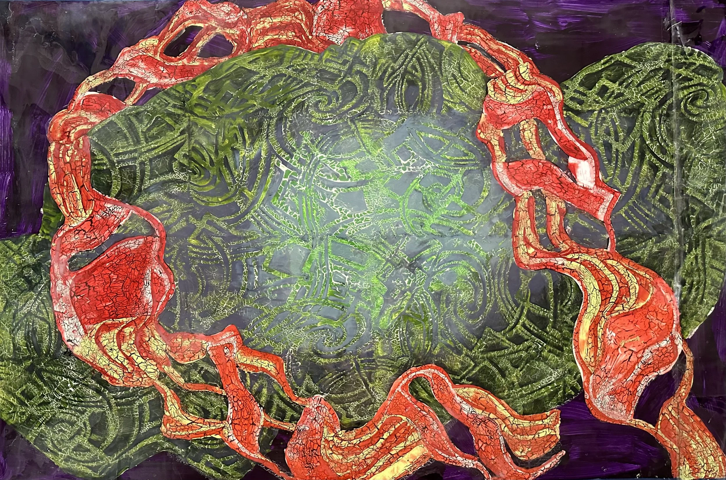 My paintings are ornamented skins peeled up from plate glass. For many years I have been interested in pattern as both orderly, rational system and, paradoxically, a means to ecstatic contemplation, the visual equivalent of chant or prayer. I begin with printed images of patterned skins - tattoos and architectural ornament - and alter these on xerox machine and computer. The resulting mechanically created designs are then carved into rubber blocks that serve as tools for the hand guided by intuition and accident. The technique I use, a hybrid of painting and printmaking, creates both dimensionality and luminosity. These qualities transform what began as flat patterning into something both tangible and unknown.The surfaces that result from this reverse painting process feel both delicately intimate and vertiginously distant. A maplike quality often results, continuing the interplay of systematic and intuitive.