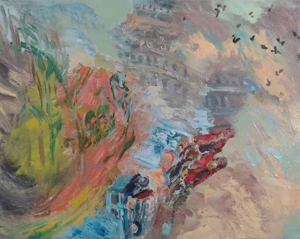 My process is oblique and subjective; I back into rather than plan imagery. I try out ideas, reject most of them, scrape away attempts and marvel over the lush surface that's left. A textured and mixed-color substrates excites me; it's a crystal ball or charged zone for the next possibility.