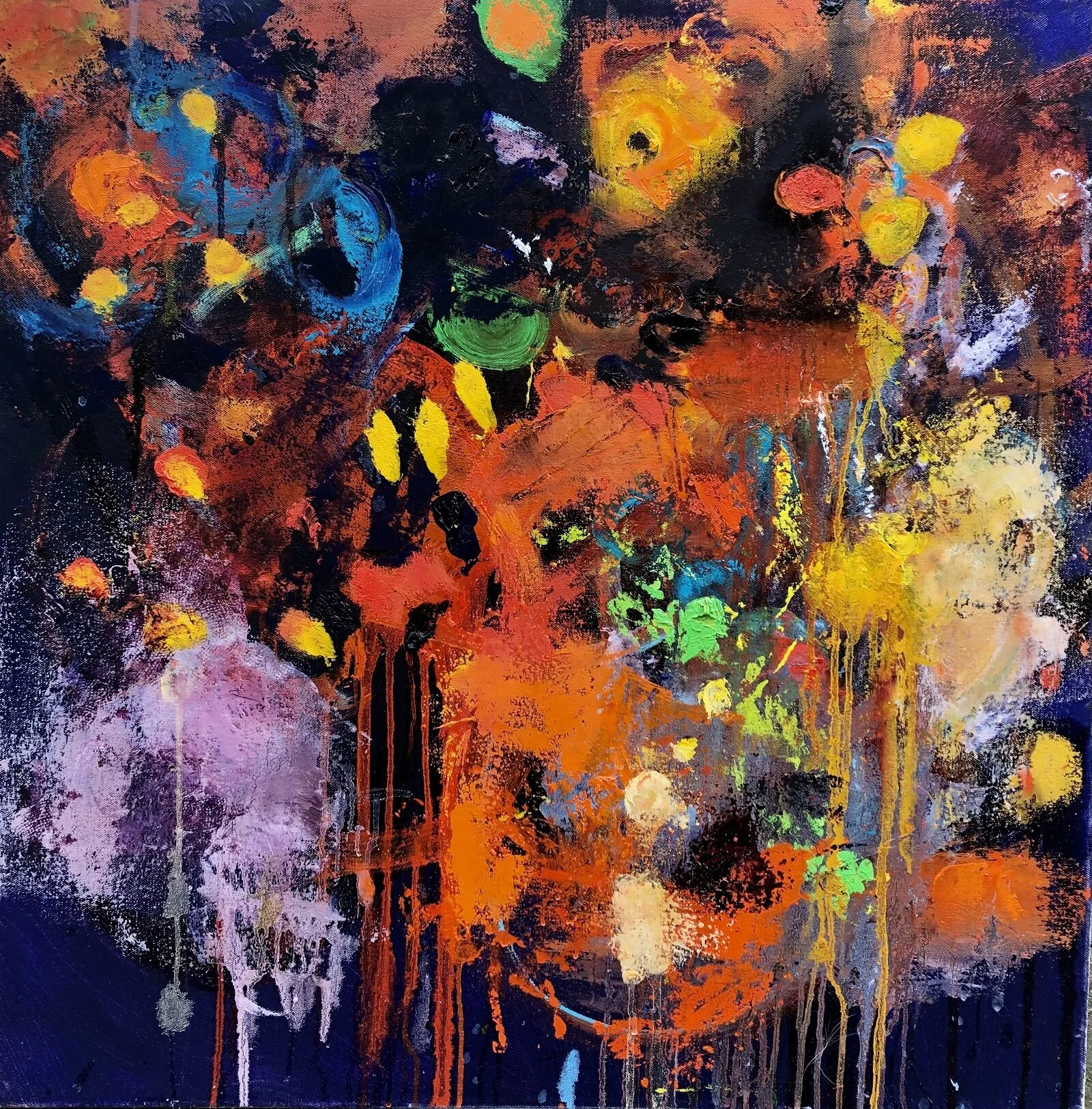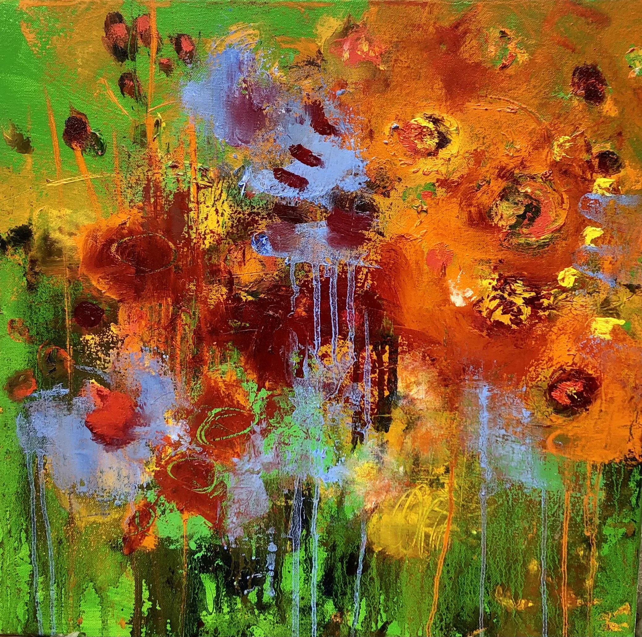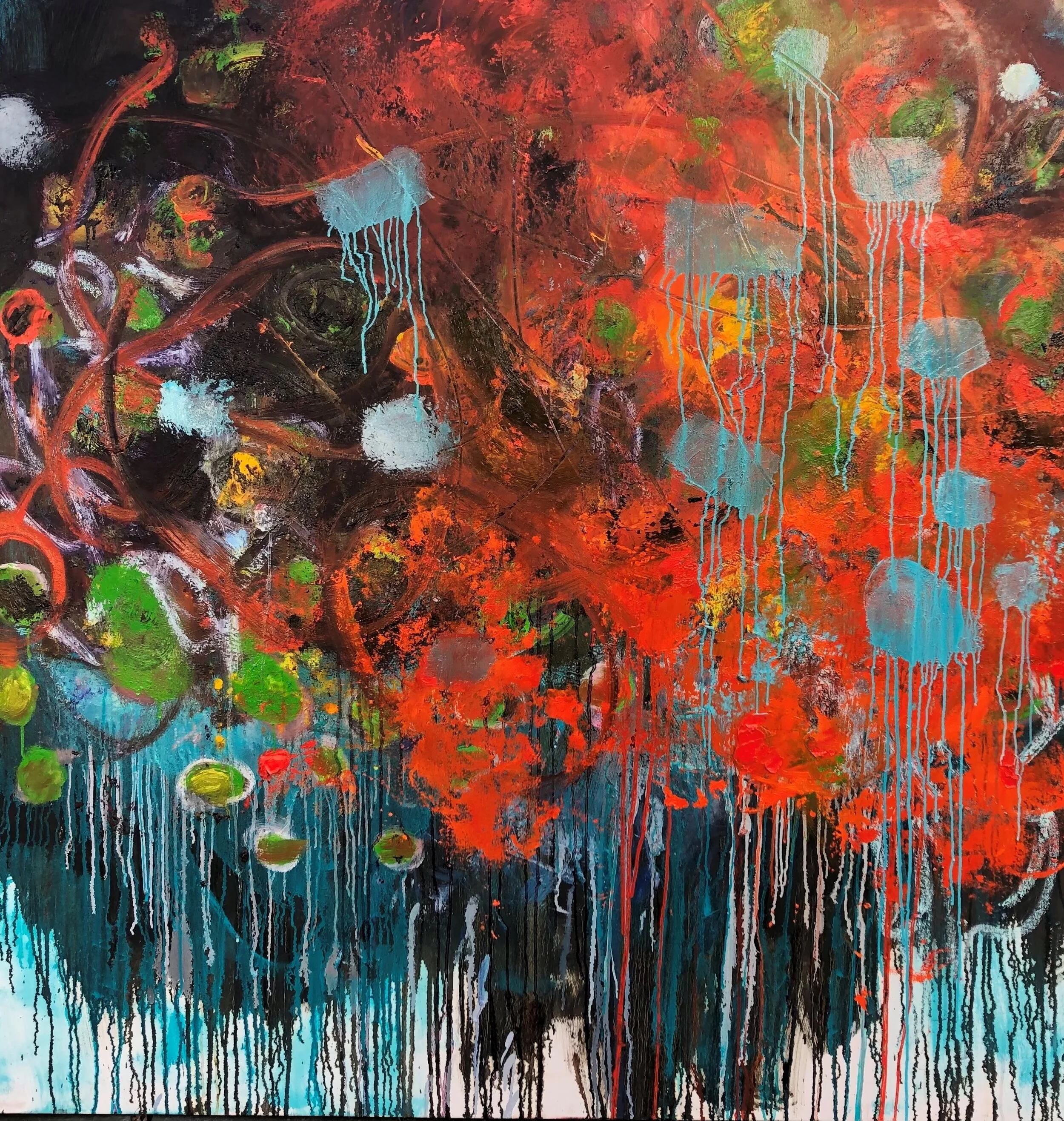 I began my art making in midlife. Once I had my children, a need to express myself creatively roared out of me in the form of painting. I took classes in painting and gradually evolved to relate very much to Abstract Expressionism. Now I have been painting for 20 years and teach Abstract Painting.
