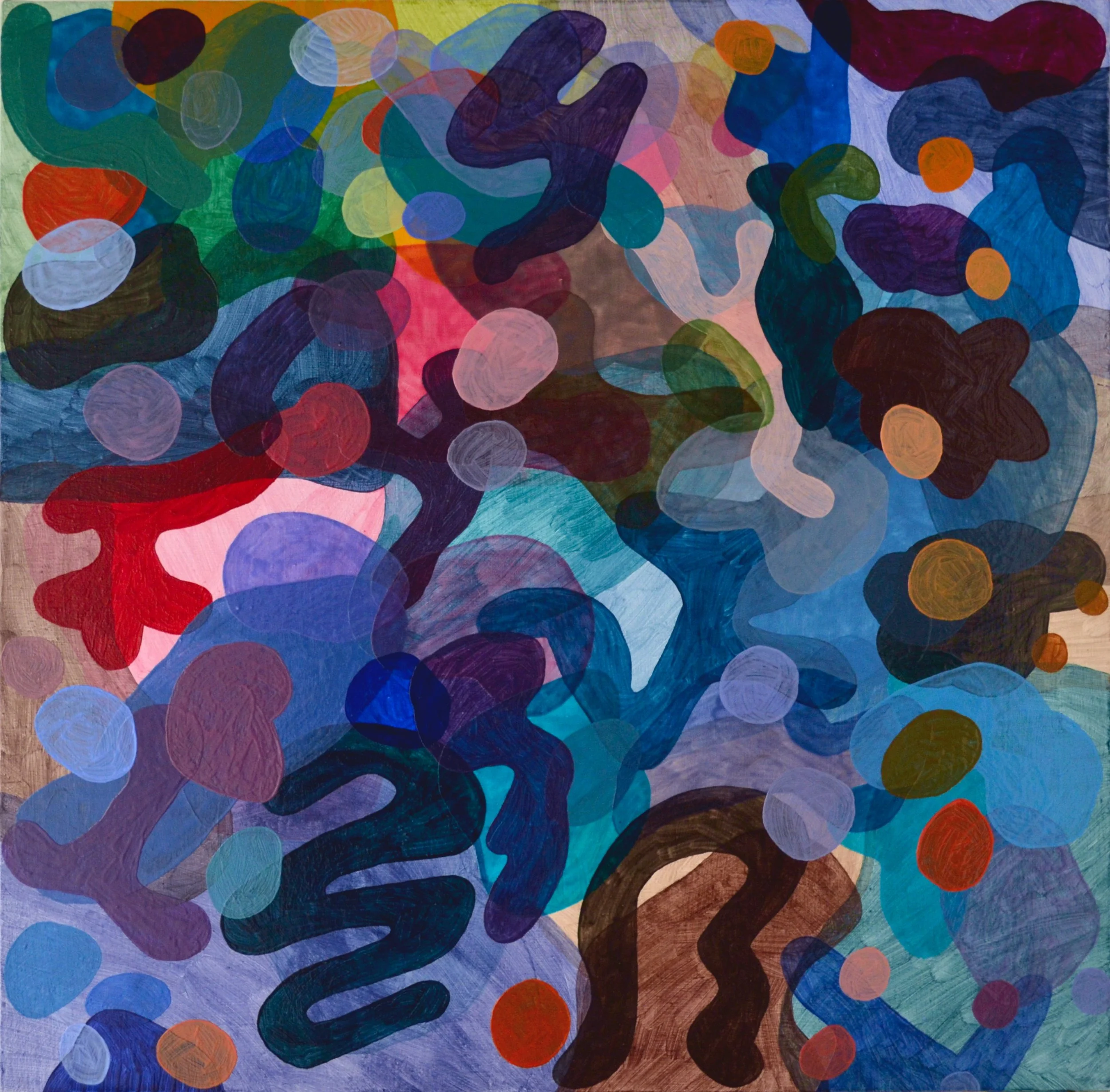 In my paintings, I primarily work with acrylics on diverse surfaces such as linen, methacrylate, and polyester film.