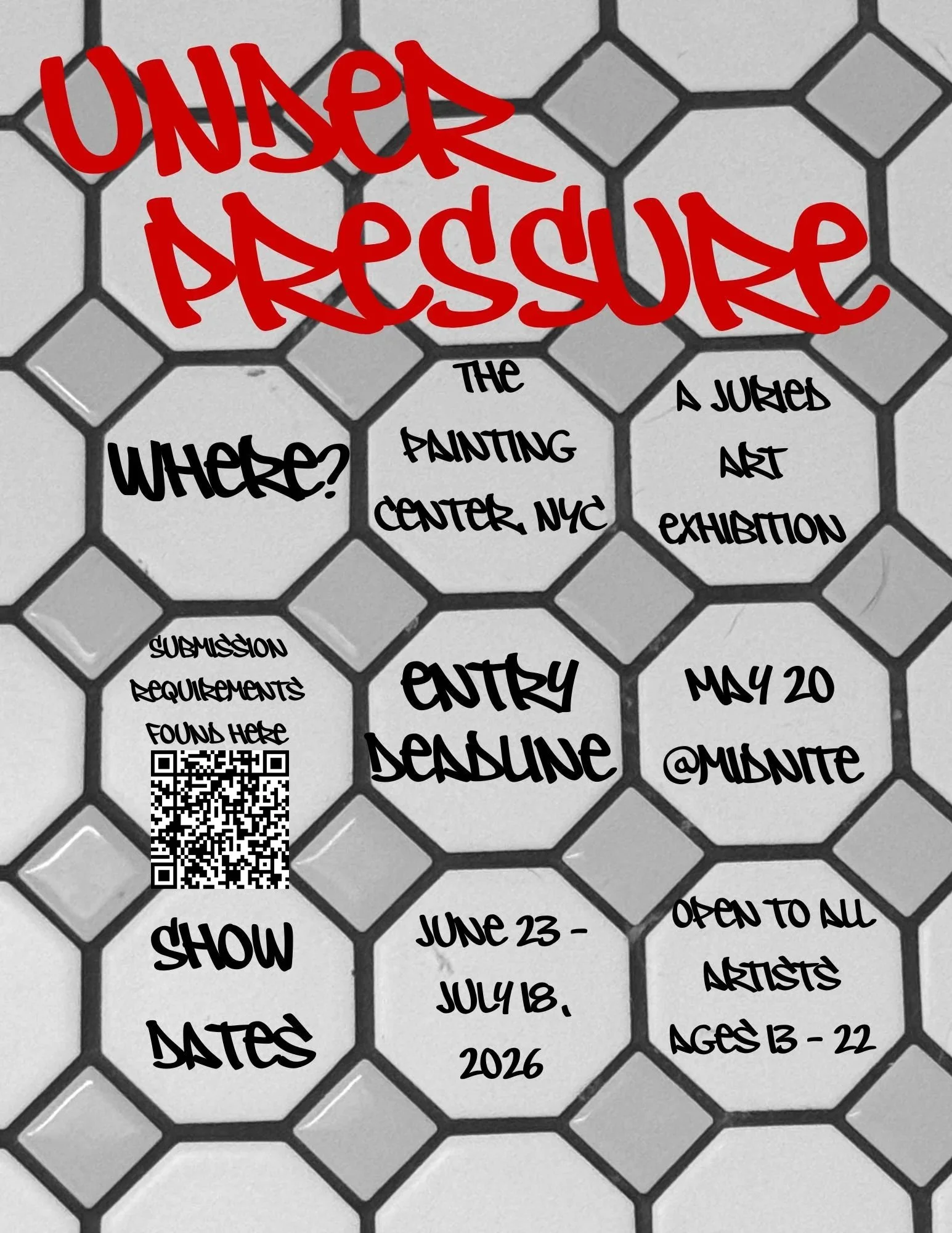The Painting Center is seeking submissions for the juried exhibition Under Pressure curated by Carrie Patterson. The exhibition will be held in person and on Artsy from June 23 – July 18, 2026, with an opening reception on Thursday, June 25. In 2026, young people are coming of age amid unprecedented change—marked by political upheaval, climate instability, and pervasive violence. Social media and emerging technologies shape their daily realities, amplifying pressures around identity, visibility, and unattainable ideals, while mental health struggles continue to rise. What does it mean to be young in a world that feels increasingly overwhelming? The exhibition Under Pressure invites artists ages 13 – 22 to respond to this moment, expressing what they think, feel, and witness while navigating a world under pressure. Artists across all styles and mediums are encouraged to apply.