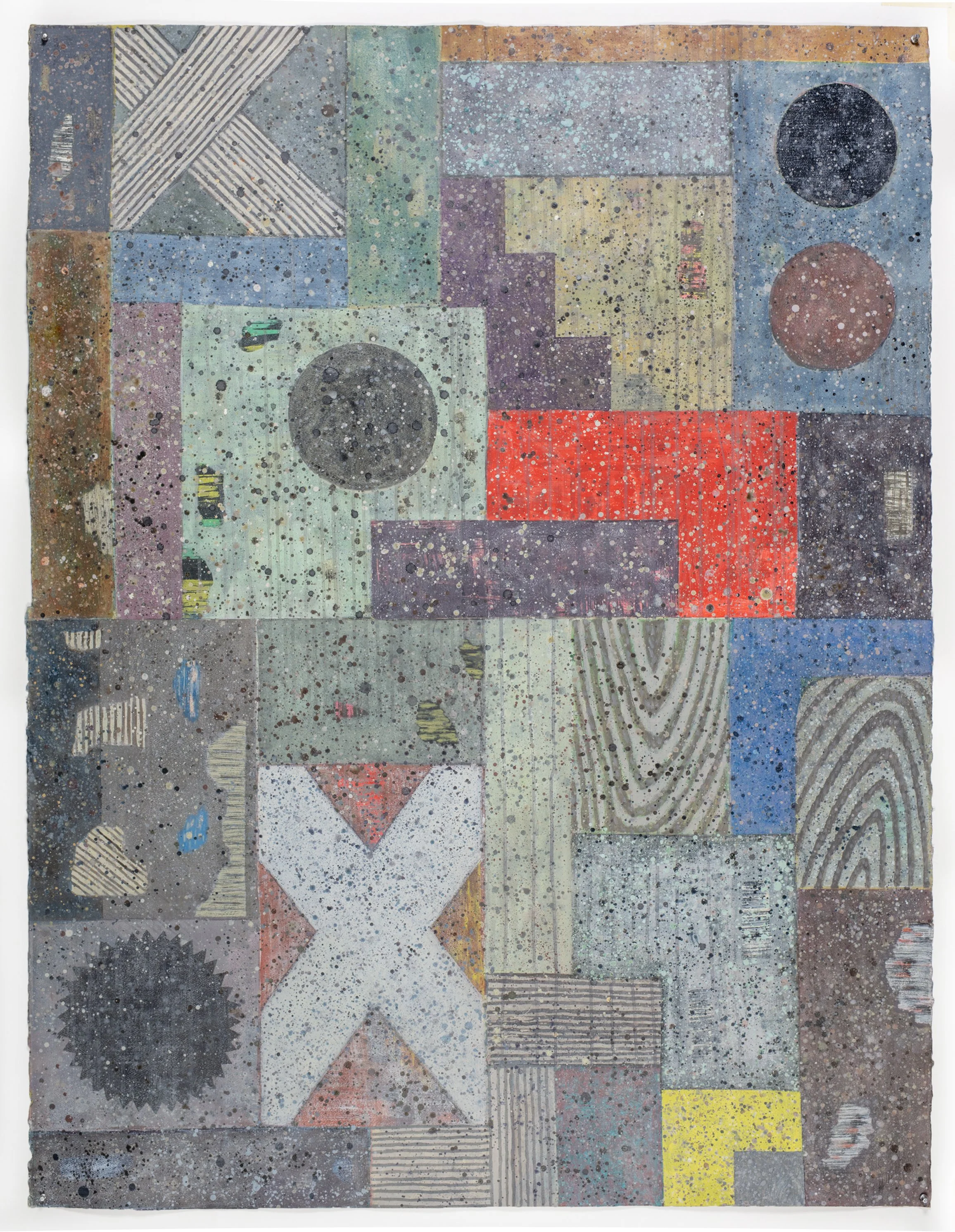 Excerpt from Geoffrey Young’s essay: “With a tile-fitter’s care in placing shapes, Sue Havens’ rage for order is balanced by her love of storm and accident. Her works on paper are filled to the brim with randomly generated distributions of rain-like dust and the debris of cosmic instability. Her concern is to activate the surface of each work, putting each set of decisions in contact with a world where unforeseen things happen. Smudges, stains, and spills find happy homes where the maker’s hand meets rigorous contingencies of all kinds. A Havens is a place where structure and collision are part of the way things are.”