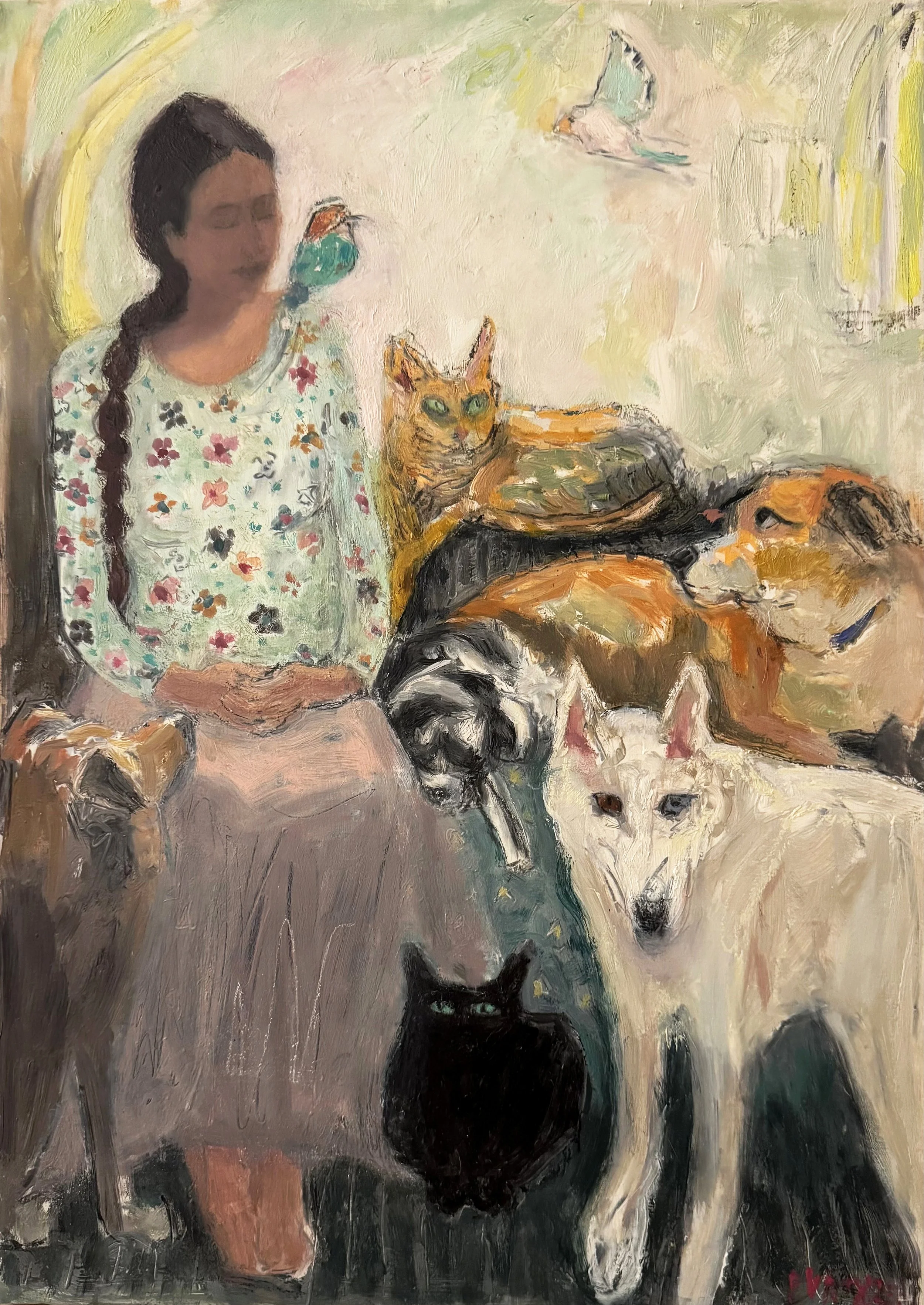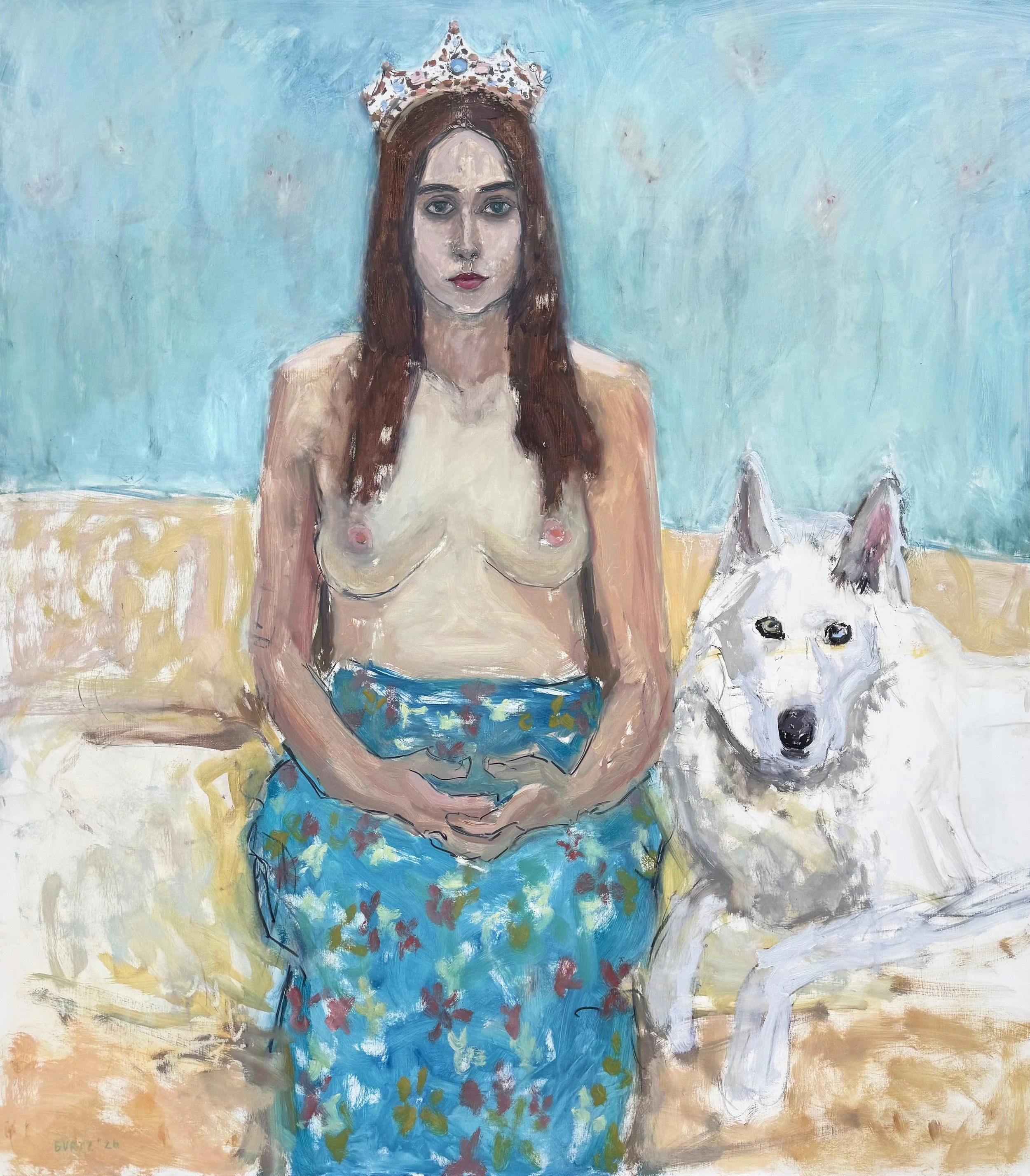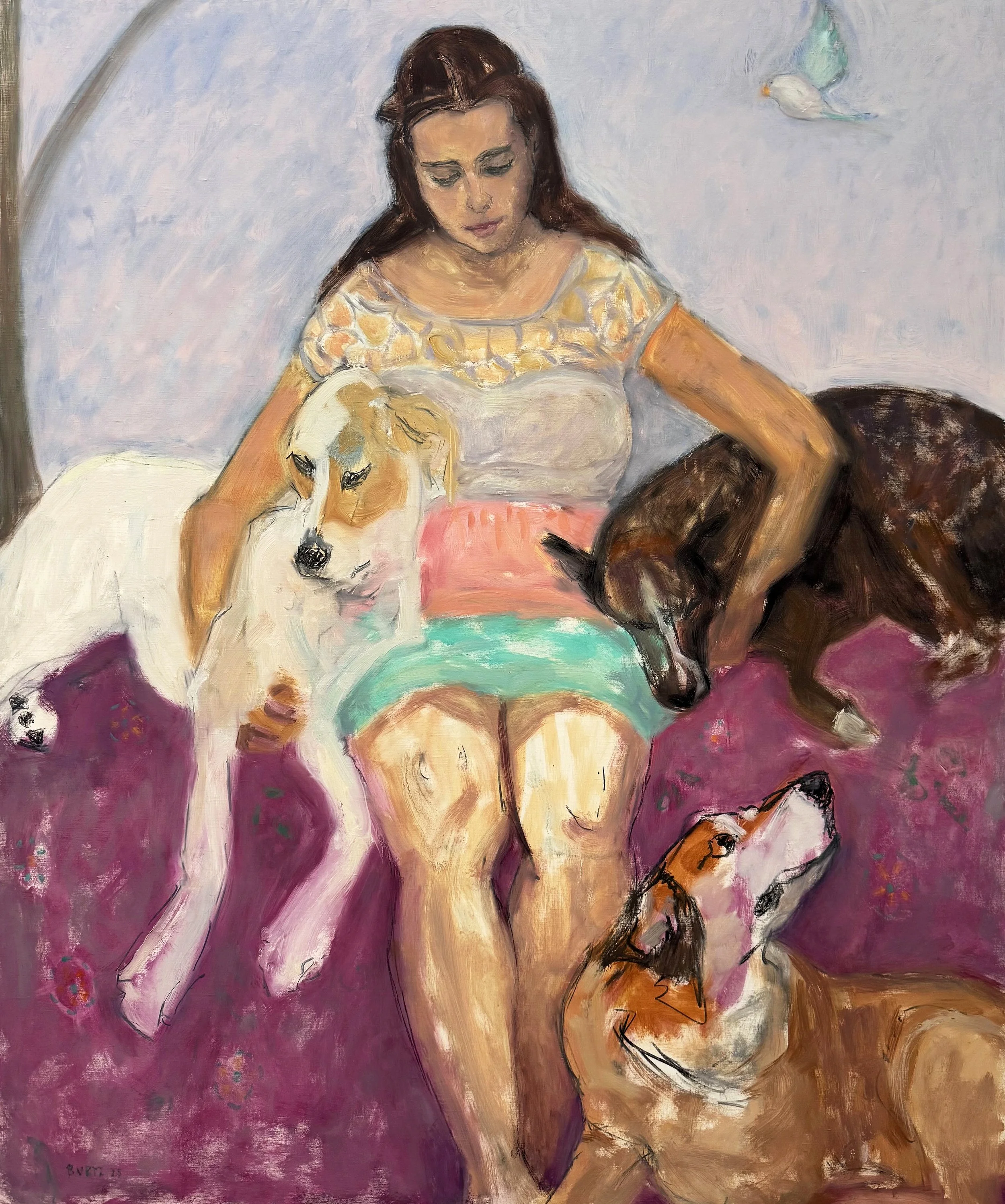 As a professional painter for forty-five years, Tracy Burtz expresses her emotions through composition, color, value, light, line, volume, and space. Her process is contemplative—less the physical frenzy that informed her early work, a result of her traditional art education. In the last twenty years, Burtz has sought to move beyond, to try to ‘forget,’ some of her earlier assumptions. Her narrative is now more focused, and her paintings have ‘simplified’, and yet are more specific. Each painting holds a process of concentrated exploration over some time, a building of abstract emotion on a two-dimensional plane. Burtz begins each painting from life, but then the painting process takes over and the model is only brought back for drawing and color information. Burtz’s ultimate goal is for the work to resonate with the viewer; that the story is intimate and meaningful. Her paintings and drawings are mostly about being a woman, often autobiographical, about life and circumstances. The intent is that they are about women, but that the story becomes a personal one of connection and significance for all viewers. This body of work often includes dogs. Burtz paints about their fidelity and relationship to her, as she says they were close at hand and rescued her from loneliness and isolation during the pandemic. For many, the embodiment of true constancy is the dog, who sits and watches and loves.