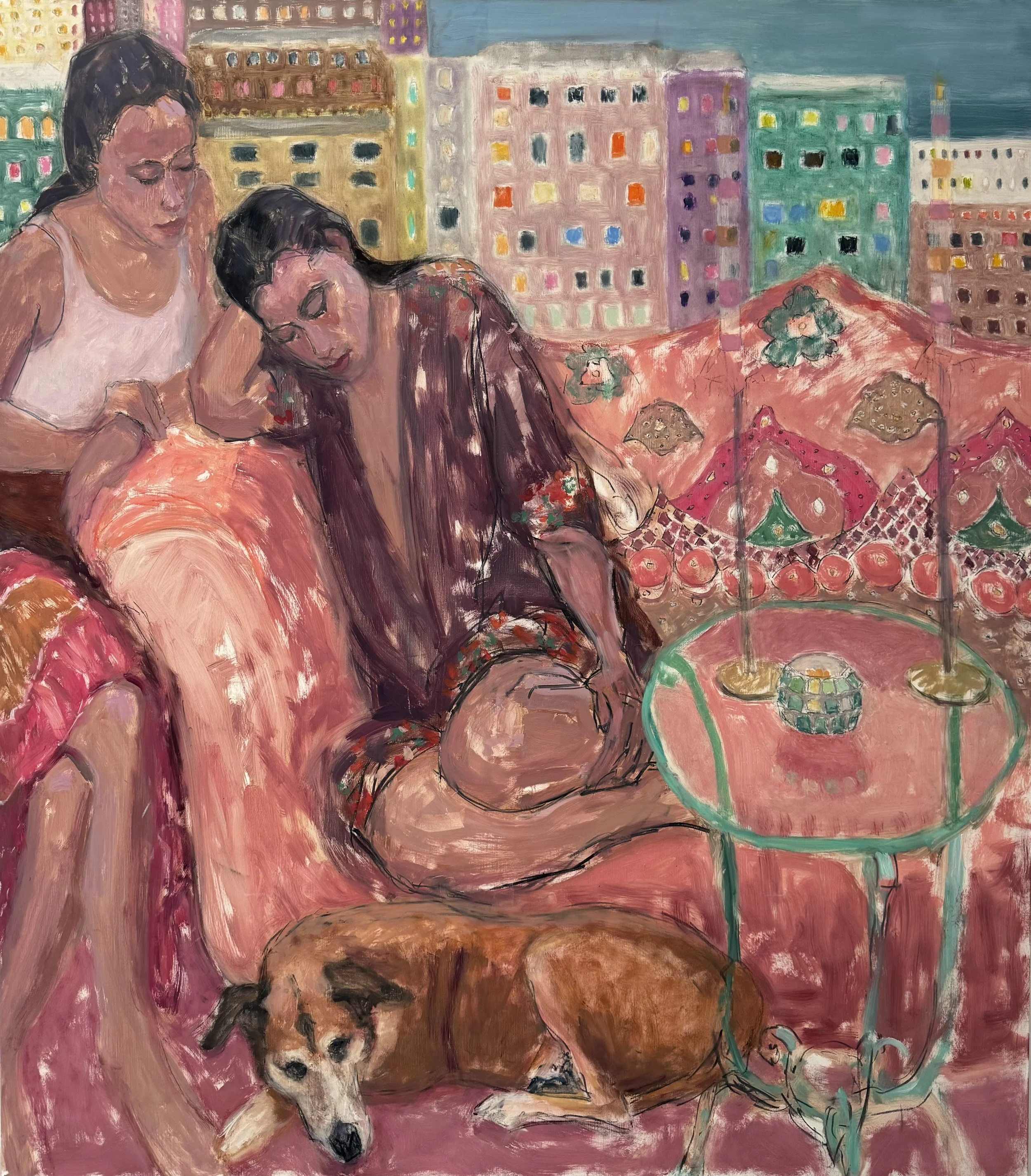 The focus is personal. Burtz draws from her own life, having grown up among four sisters, having lost her father at a young age. The world she constructs is one governed by women: emotionally, spatially, and symbolically. Within this landscape, women often appear alongside animals, particularly dogs whose bodies form a protective, gentle constellation around her. These animals are not decorative, they are essential, signifying unconditional love, safety, and steadfast presence.